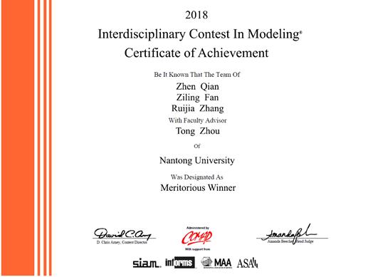 于美国东部时间2018年2月8日至2月12日举行的2018年美国大学生数学建模竞赛(MCM/ICM),今日竞赛成绩揭晓。来自304永利集团官网入口地理信息科学专业的团队(队员钱振、范紫灵、张瑞嘉,指导老师周侗)发挥出色,荣获M奖(一等奖)。这是永利官网近年来首次获得该级别奖项,同时也平了我校在美国大学生数学建模竞赛中的最好成绩。