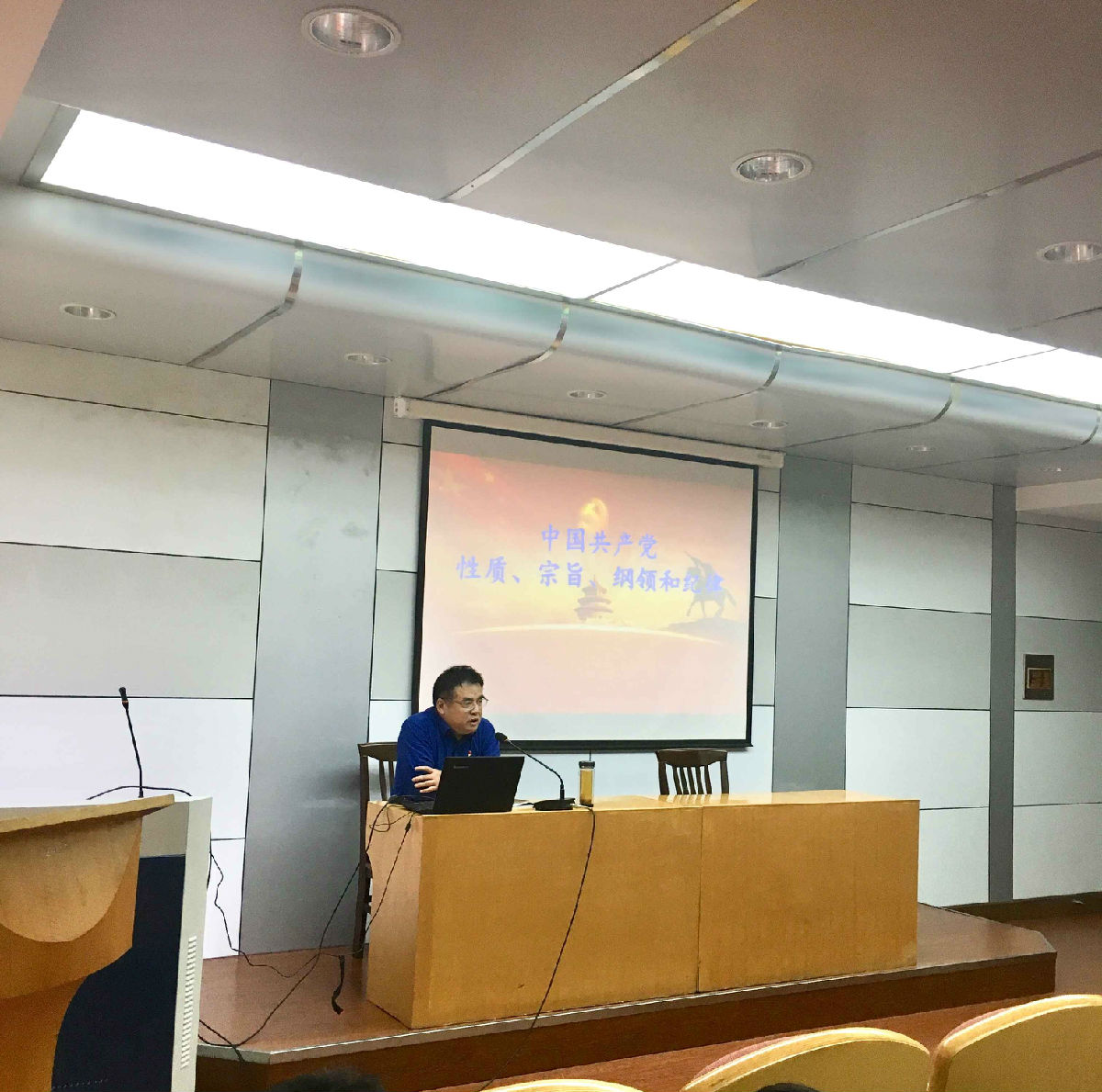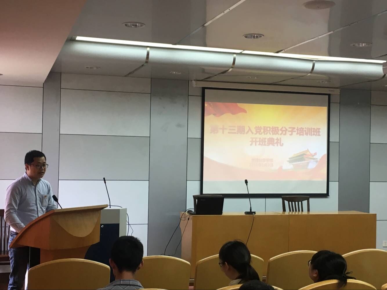 开班仪式后,学院党总支书记盛明随后为70名培训班学员作《中国共产党的性质、宗旨、纲领和纪律》专题辅导讲座。盛书记带领同学们深入学习了马克思主义在中国的传播过程以及中国共产党的成长历史,结合历史典故深入阐述了中国共产党的性质,强调了全心全意为人民服务的宗旨,以及现阶段党的纲领和各项纪律。他要求学员们进一步坚定共产主义理想信念,不断充实自己、提高自己、完善自己,积极发挥榜样示范作用,在实现中国梦的生动实践中放飞青春梦想,勇做时代的弄潮儿,积极投身于中华民族伟大复兴的建设中。