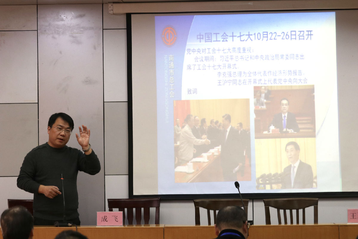 南通市总工会组织部长成飞同志就“学好工会十七大,当好职工娘家人”进行了专题讲座。他从中国工会十七大简况、习近平总书记关于工人阶级和工会工作的重要论述、如何建设“六有”工会、做好工会工作体会通大嘉善等四方面出发,传达总书记对工会干部提出的新要求,告诫干部们应维护职工合法权益,竭诚服务职工,从改变工作能力、工作方法的角度来发展基层改革,切实落实十七大会议成果。通过对具体事例的分析,成飞为干部们提出了切实可行的建议,并对干部们的未来工作提出殷切期望。