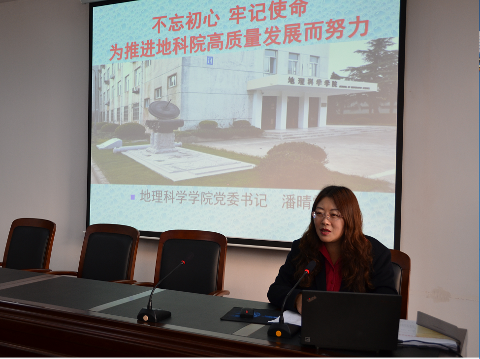 潘晴雯从“不忘初心,永远为人民谋幸福”、“牢记使命,永远为民族谋复兴”、“奋发有为,创造新时代光辉业绩”、“凝心聚力,推动学院跨越发展”等四个方面,围绕“初心是什么、使命干什么、奋斗比什么”做了深入解读。