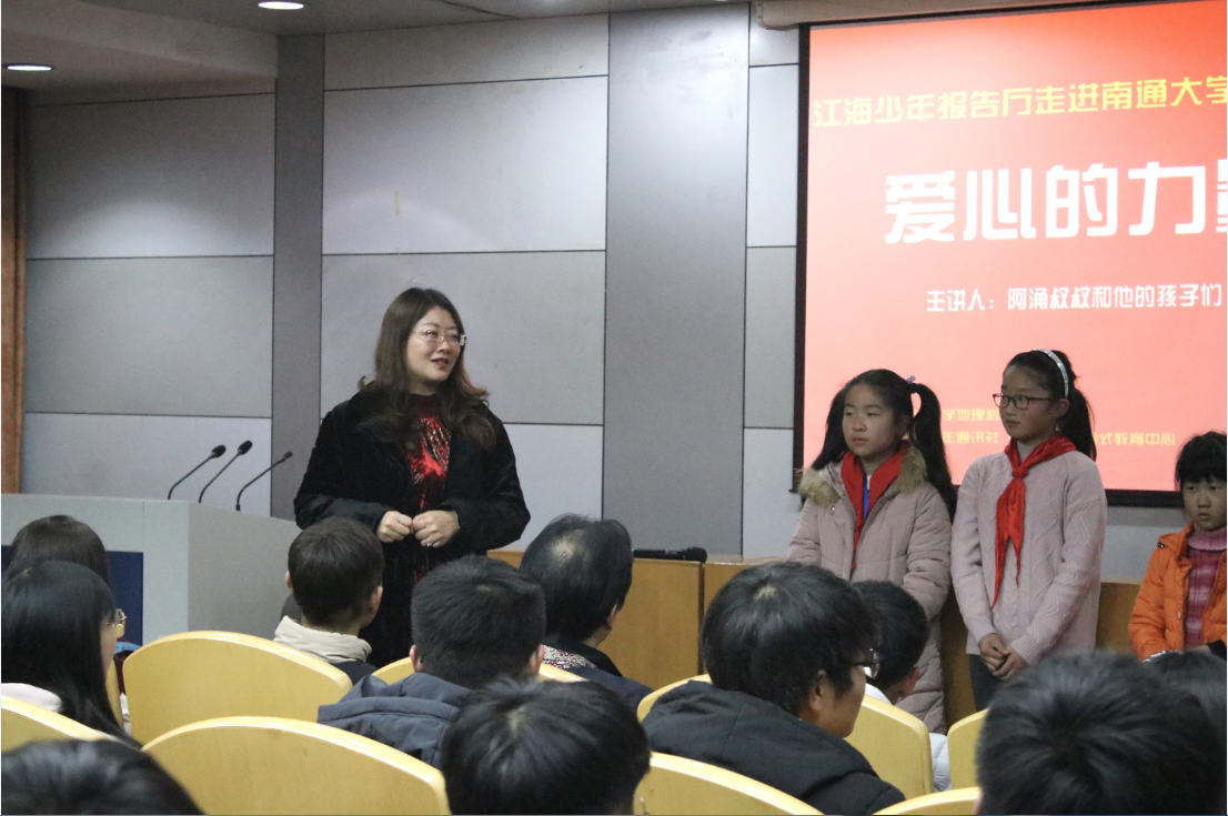 阿涌叔叔体验式教育中心成员、江海少年通讯社成员邬希瑞主持报告会。以“爱心的力量”为主题的宣讲报告会在一段暖心视频中开场。江海少年通讯社小使者队成员吴玎宸、林雨萌、于盛一等小朋友先后上台分享自己在关爱视障少年志愿者活动的成长经历和心得感悟。