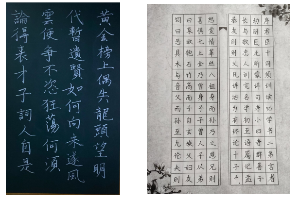 本期培训的内容为“三字一画”,即粉笔字、钢笔字、毛笔字以及专业板画技能。地师191班在董艳老师的督促下,每日练习偏旁部首、单字练习、古诗词临摹与地理版图的绘制。次日,董老师先带领大家欣赏前一日优秀作品,并对作业中不足之处进行指正,之后对当日训练内容和作业要求进行了详细说明,并指导板画的绘画技巧。课程收官之日,董老师还向同学们推荐优质字帖田英章,开设教师职业技能再训练的课程,同学们可以根据自身需要与自觉程度加入,跟随老师继续学习。地师192班由钱鹏教授在线上指导,前两天集中训练钢笔字与板画,练习内容涵盖《百家姓》、《千字文》、《三字经》等。钱老师敦促同学们练字之余,还教授了其中的地理知识。后几天集中训练毛笔字,钱老师根据字词结构推荐同学们练习唐朝诗人李白的《望庐山瀑布》一诗,其中有同学的表现尤为出色,获得老师和同学们的一致好评。课程结束后,钱老师还特意开设直播课,为同学们指正不足并给予希冀。一周的时间虽短,但地师班的同学们都认真对待,收获颇丰。