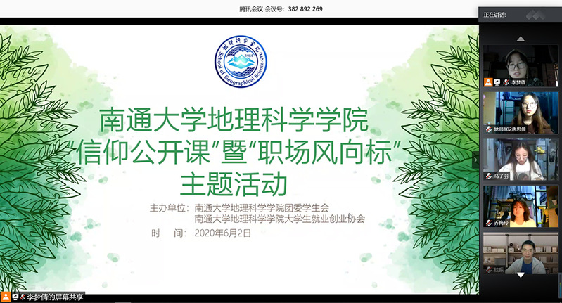 地理师范161陆晨邀、环境科学161李梦云分别被兰州大学和南京信息工程大学录取,他们就如何度过充实的大学生活、怎样备战考研等详细给出了自己的意见和建议。地理信息161钱振被推免至南京师范大学,他以“筑梦”为引,讲述了自己大学四年在科研征程上的心路历程。江苏省第十四届大学生职业规划大赛一等奖获得者、旅游管理172吴琦引导大家深入思考青春的意义,激发同学们以奋斗者的姿态答好自己的大学之卷。长江微笑工作室成员、人文地理规划182何琛结合自己创业的亲身实践,鼔励大家心怀梦想、迎难而上。