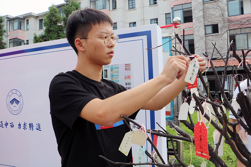 新生们纷纷在许愿树旁许下自己对未来的美好愿望。