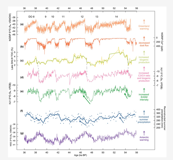 两极冰芯研究揭示格陵兰Dansgaard-Oeschger(DO)旋回的暖相位对应于南极变冷,反之亦然,提出半球间热量再分配的“bipolar seesaw”机制。然而,由于两极冰芯年代学的不确定性,尤其冰-气年龄差异(即Δage)的约束问题,导致南北半球千年尺度气候事件的相位关系和触发机制仍存在较大争议。通过同一地质载体的不同代用指标研究南北半球千年尺度事件的相位关系,或许可以有效避免两极冰芯记录对比的年代学问题。