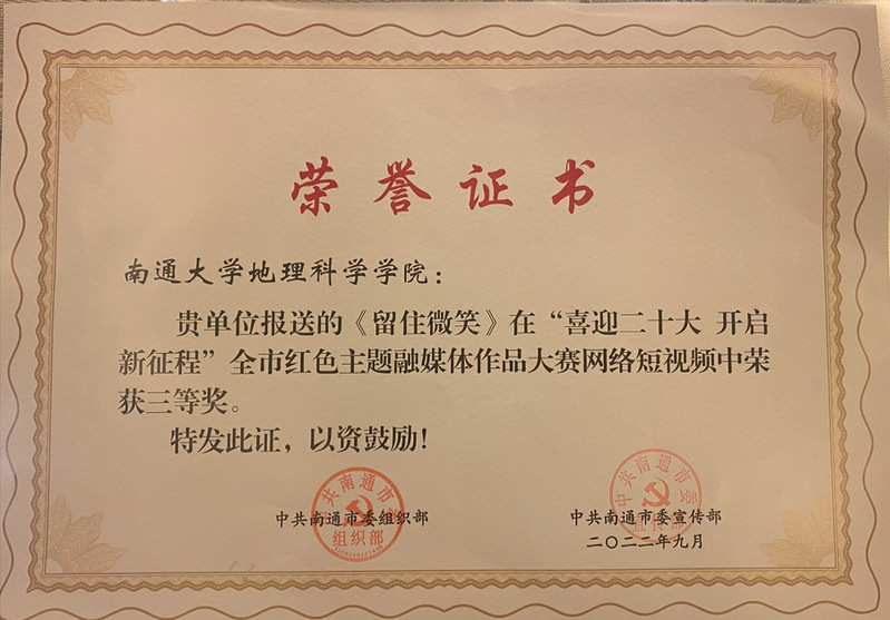 9月26日,南通市委组织部、宣传部联合发文并隆重举行表彰大会,表彰“喜迎二十大,开启新征程”全市红色主题融媒体作品大赛获奖单位和作品。永利官网制作选送的作品《留住微笑》喜获网络短视频类三等奖。