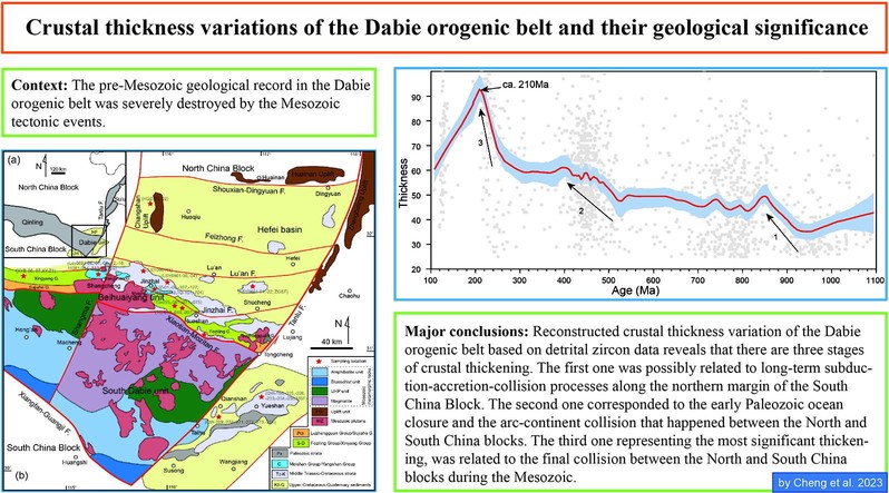 大别造山带与秦岭造山带一起构成中国乃至东亚最重要的一个碰撞造山带,其以广泛出露的中生代超高压变质岩而闻名于世。由于中生代的强烈碰撞及一系列碰撞后事件,大别造山带的前中生代地质记录保存较差,从而限制了对其构造演化的理解,而这些可能保存在周围的沉积岩(物)中。本文对大别造山带及其周缘沉积岩(物)48件样品约4000颗碎屑锆石开展了U-Pb定年和微量元素分析,利用最新提出的碎屑锆石地壳厚度指标重建了其地壳厚度演化史,并以此讨论了其地壳演化意义。结果认为:1)大别山新元古代以来共发生3次地壳加厚事件,分别在约900-800Ma,530-400Ma和250-210Ma,分别对应3次华南与华北板块的汇聚事件;2)碎屑锆石的年谱特征与厚度变化曲线证明中国大陆板块参与了全球的超大陆旋回;3)晚太古代的地壳减薄可能与板块运动的开始有关。研究结果对提高大别造山带乃至全球地壳演化史的认识具有重要意义。
