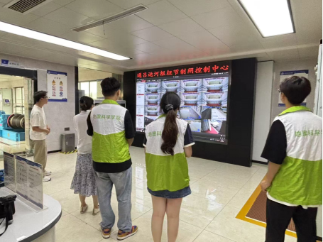 团队走进通吕运河水利枢纽开展研学。通过观看《水利南通 网织未来》宣传片,大家看到南通如何以“现代水网”建设破解“滨江临海”的治水难题。中控室里,实时跳动的水位、流量数据与自动化巡检系统,让志愿者们直观感受“智慧水利”的科技力量。泵站厂房里,工程师详解工程在防洪排涝、农田灌溉、改善生态环境等方面为民众生活带来的积极影响。这场沉浸式学习,让志愿者开启与张謇治水历史的跨世纪对话,解锁水利工程的“智慧密码”,既读懂南通“因水而兴”的城市基因,更明晰青年一代在治水护水中的使命传承。