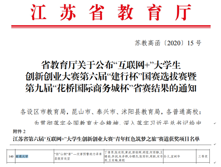 8月24日,由江苏省教育厅联合江苏省委统战部等13个部门共同举办,南京航空航天大学等承办的第六届江苏“互联网+”大学生创新创业大赛省赛决赛圆满落下帷幕。经过激烈角逐,永利官网宜树华教授和孙义老师指导的项目—“拍”山倒“害”—灾害预警助力泽库县脱贫攻坚荣获红旅赛道三等奖。为永利官网进一步提升科研与社会需求结合的能力、以及今后项目申请、比赛准备等方面积累了较为充分的经验。